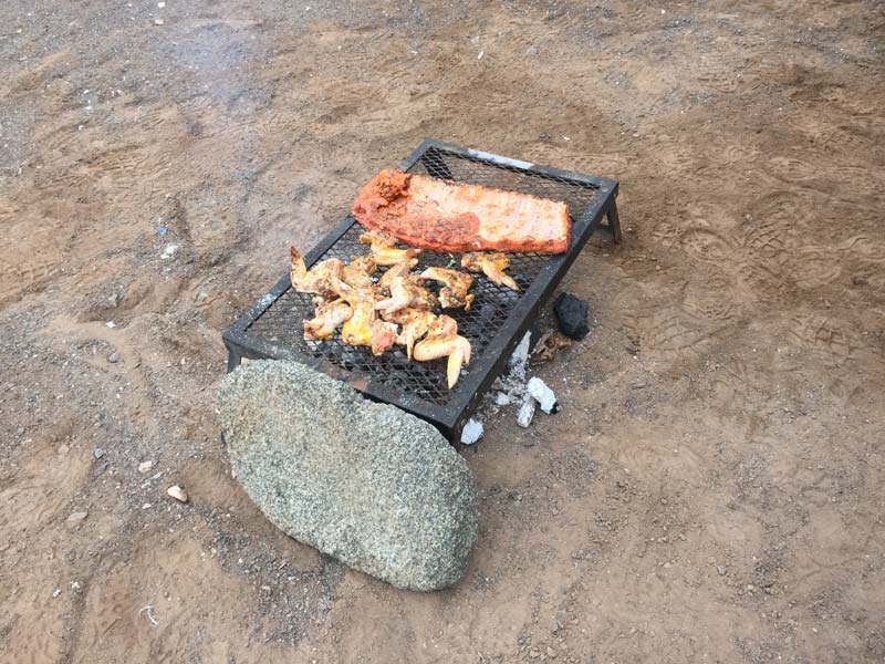 Steven se encargó de buscar las piedras más lejanas para afirmar el toldo, vaya a saber uno las cábalas que tienen los tucanes.