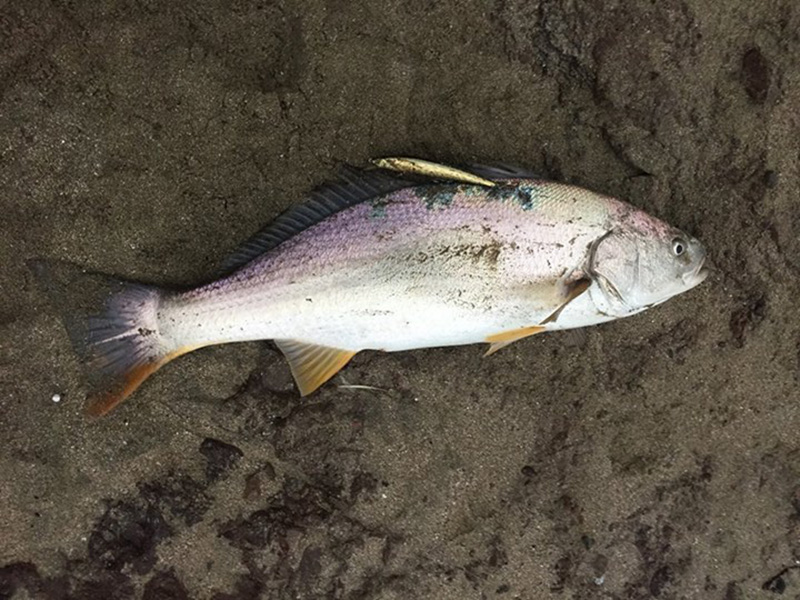 Viernes: Ahora si me levanté, llegue muy temprano, con los primeros rayos de luz ya estaba dando mis lances pegado a la roca del lado norte, diviso al tomacho y unos 3 pescadores más al centro de la playa, arriba un grupo de jóvenes armando sus cañas, hace rato no tenía la playa para mi, y cómo hace mucho tiempo veo las primeras colas, imponentes en la orilla , ya me había acostumbrado al whassap diciendo...te fuiste y los 30 min empezaron a colear por todos lados, la playa estaba muy rara, la corriente fuerte con un oleaje alto de 2,7 mtrs. mucha agua pero la primera parte de la playa, unos 30 metros plana, absolutamente plana, luego un corte y atrás un canalon profundo de 2 a 3 metros, había que tener buen lance para posicionar el señuelos detrás del canalon, justo detras de la ola para avanzar detras de ellas hasta la rompiente, luego recoger rápido y volver a lanzar, tres lances y por fin un pafffff, era pequeña, salto fuera del agua, arrancó, aprovecho la resaca pero no fue dificil cobrarla, unos 2 kilos, pequeña si... pero, hace rato que no disfrutaba de una buena corvina fresca. La guarde en la roca.