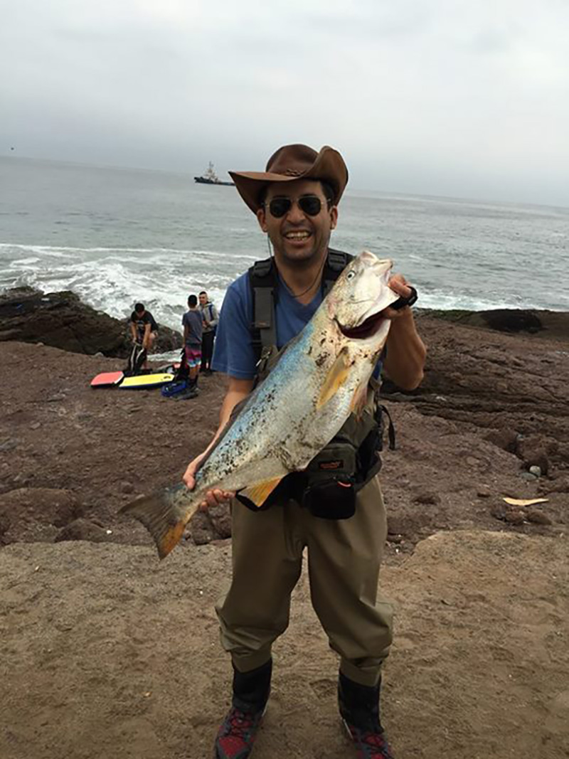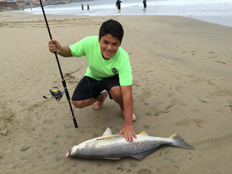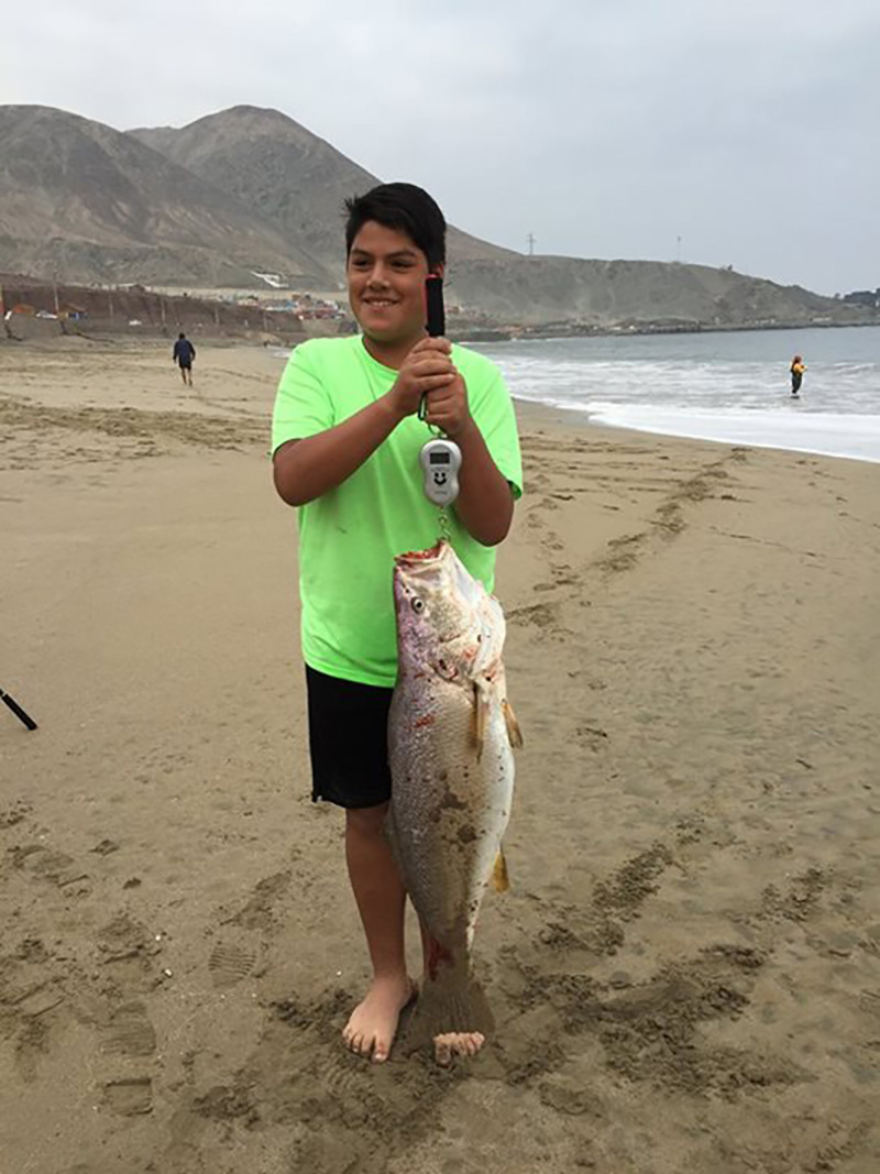 Se me acerca un joven de unos 16 años, el bryan, sin wader y colorado de frio y me dice, ¿tiene una?, ¿usted es don mauricio?, siempre leo sus reportes. me alegro la compañia ya que la pelea la empezaba a ganar y los nervios ya se habían ido, le pido si me deja sacarla antes que se ponga a tirar y me dice claro, voy a pescar a la otra orilla, lamentablemente el amigo que andaba con el no tuvo la misma deferencia y me enredo en medio de la pelea, la rapala pegada en la punta de mi caña pero ya la corvina estaba más controlada, lo que dió tiempo para desenredarla, finalmente la acerco, a ratos divisaba entre la espuma una aleta dorsal, llegué a pensar podía ser un toyo por cómo nadaba, sin entregarse y con mucha potencia mas no mucha velocidad pero no, era una bonita corvina de 7 kilos enganchada del lomo, lo que explicaba la inusual pelea.